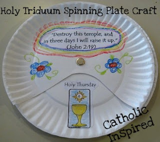 Here is a craft that I thought up and did with my younger kids as a quick fun afternoon project. It's a fun craft to explain the Easter Triduum. The plate spins to reveal the days of the Triduum until Easter. It also has the Bible verse from John 2:19, where Jesus spoke of his Resurrection, pasted on it.